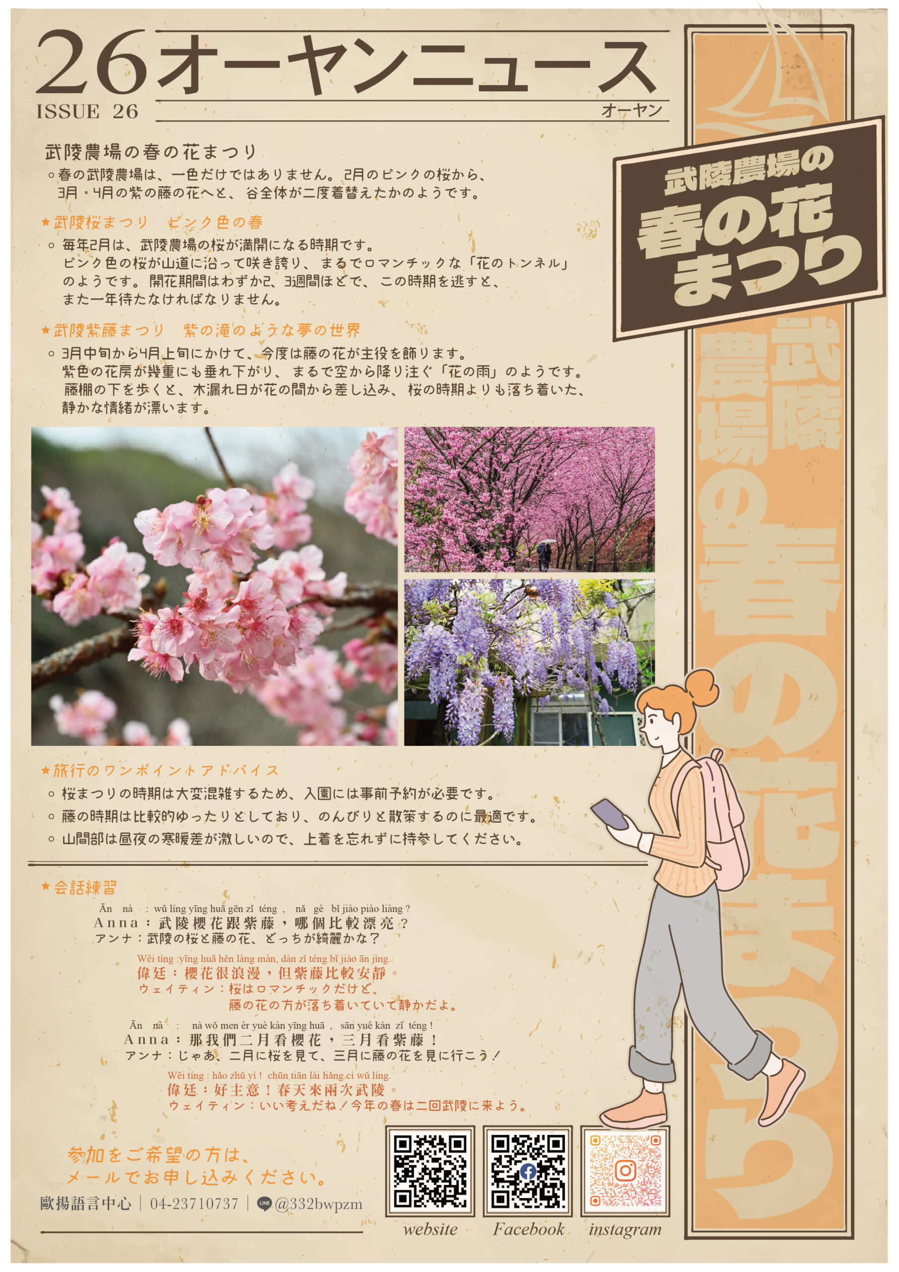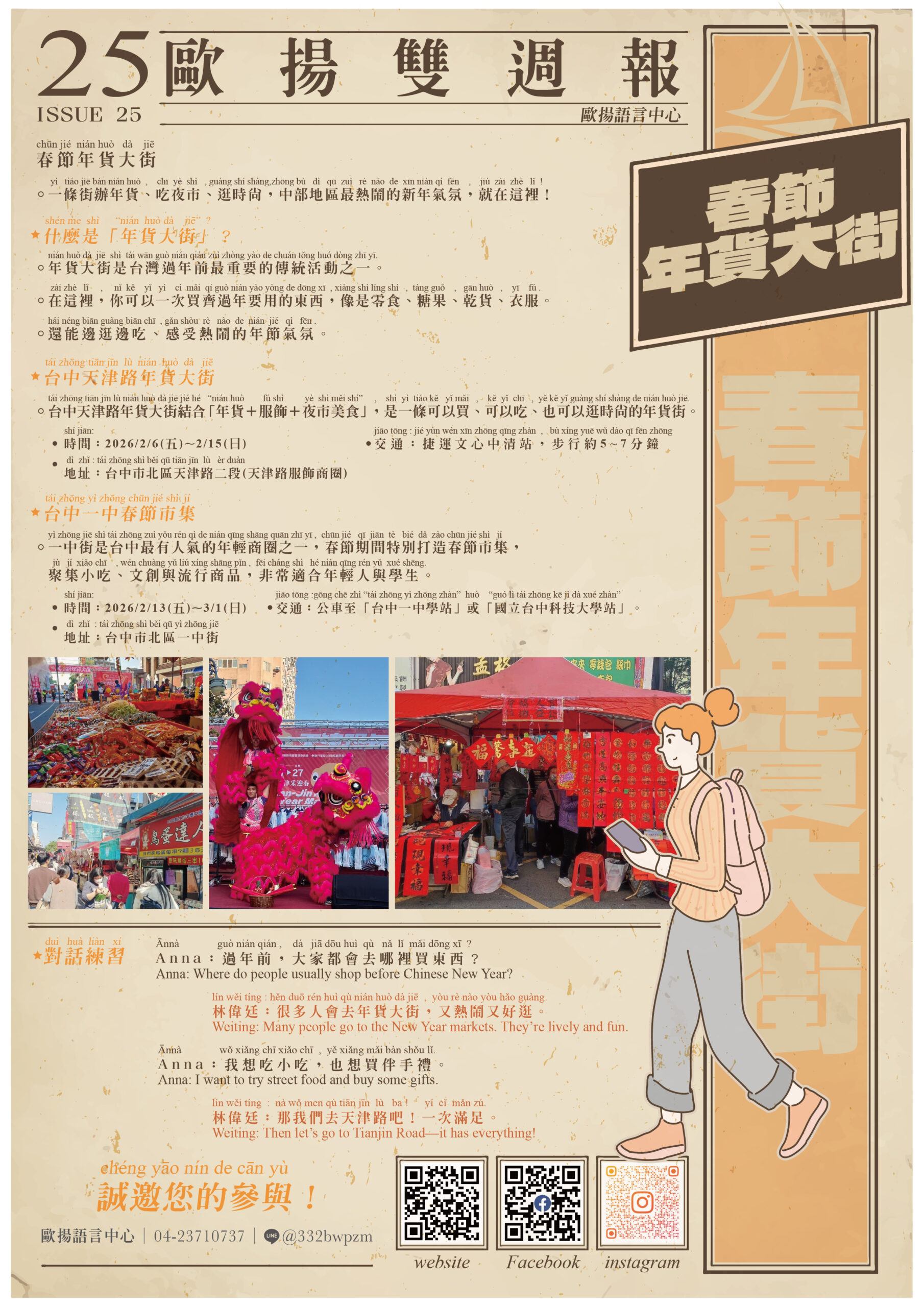 ニュースレター ホーム/ニュースレター 年度 2025 2026 期別 Q1 Q2 Q3 Q4 2026/02-1 春節年貨大街 中文對照 2026/01-2 台湾必見 ジミー幾米 視覚芸術サーカス 中文對照 2026/01-1 2026台中国家歌劇院春節特別上映会 中文對照 2025/12-2 2025 台中クリスマスカーニバル 中文對照 2025/12-1 台中国際插画博覧会 中文對照 2025/11-2 大閘蟹の旬の季節 中文對照 2025/11-1 春水堂 春秋山林 中文對照 2025/10-2 台湾の台風休暇 中文對照 2025/10-1 日本人の目から見た台湾の男性 中文對照 2025/09-2 月餅、灯籠、伝説 台湾の神秘的な中秋節を探検しましょう 中文對照 2025/09-1 台湾特有動物-石虎 中文對照 2025/08-2 七夕最もロマンチックな約束 中文對照 2025/08-1 八月八日父の日 中文對照 2025/07-2 フルーツで見る台湾:夏の甘い思い出 中文對照 2025/07-1 台中の公共交通ガイド 中文對照 2025/06-2 一緒に台湾のコンビニを知ろう! 中文對照 2025/06-1 タイトル:台湾の朝を知ろう! 中文對照 2025/05-2 台湾の端午節は一体何?! 粽とドラゴンボートを理解しよう 中文對照 2025/05-1 スポーツ、ここから始めましょう:台中市北区国民運動センター / 台湾の誇り 中文對照 2025/04-2 台中 ─ 外国人にとって学習と交流に最適な都市 / オーヤン言語センター主催イベント「言語交換 × グルメ × 文化交流」 中文對照 2025/04-1 清明節(せいめいせつ)の味わい:お盆と潤餅(ルンビン) / 潤餅(るんびん):清明節に欠かせない「春巻き」 中文對照 2025/03-2 桜の美しさ:花言葉と名所ガイド 中文對照 2025/03-1 第一部分:媽祖への信仰と歴史 / 第二部分:大甲媽祖巡礼の文化と特色 中文對照 2025/02-2 第一部分:台湾のお餅(麻糬)について / 第二部分:元宵節(げんしょうせつ)の由来と風習 中文對照 2025/02-1 台中での旧正月のイベント(台中過年活動) / 台湾の旧正月「春節」の過ごし方 中文對照